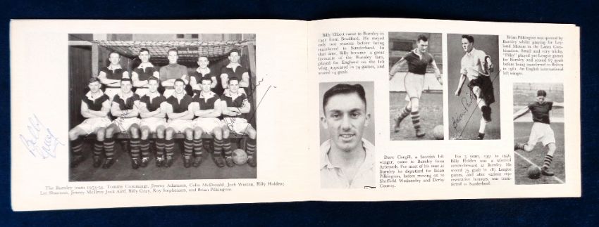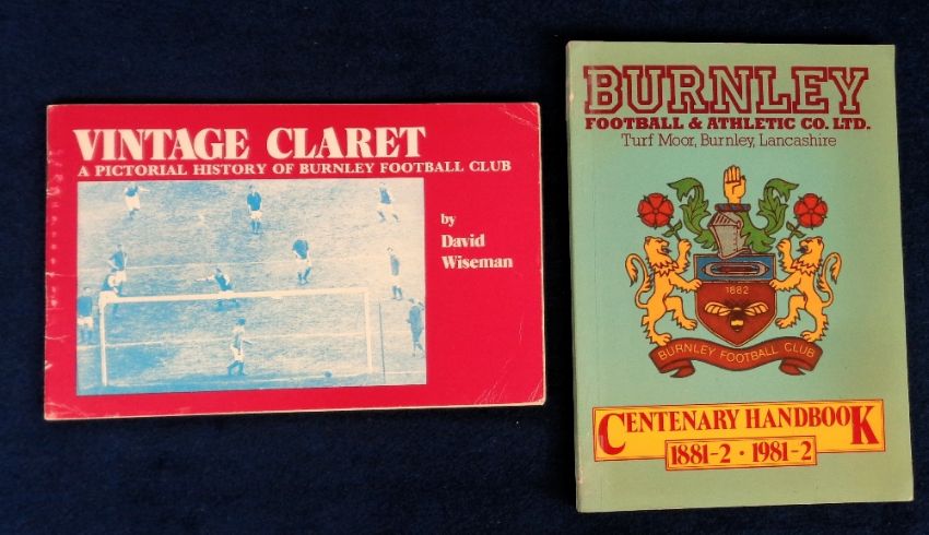 Football, Burnley FC, two booklets each with multiple signatures 'Vintage Claret A Pictorial History of Burnley Football Club' by David Wiseman 1975 signed by the Author plus 21 other original signatures inside including McIlroy, Adamson, Morgan, Miller, Blacklaw etc. Also Burnley Centenary Handbook 1881-1981 with 34 original signatures inside (gd)
