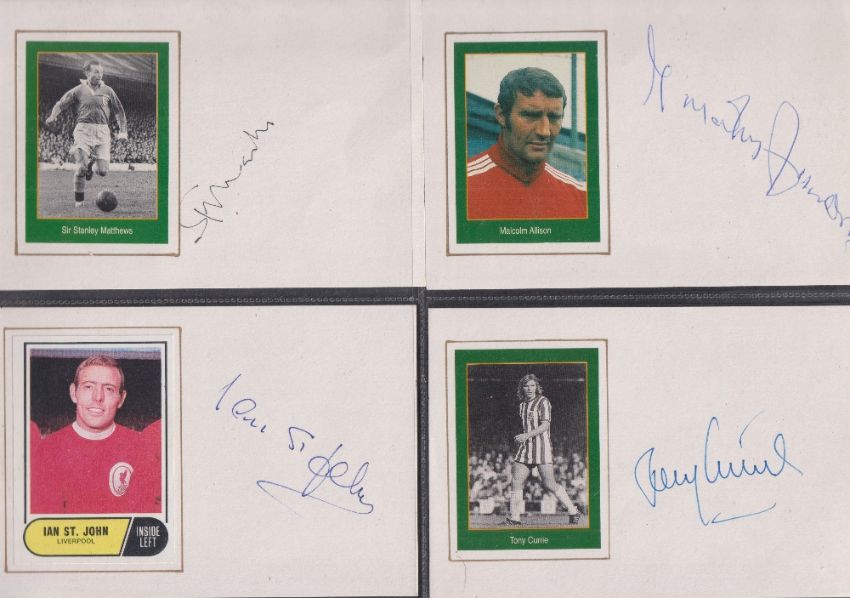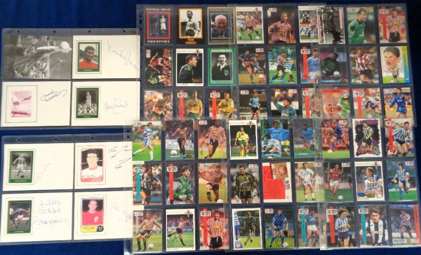 Trade cards / autographs, a collection of 62 different trade cards, all with original signatures some with multiples of the same player but on different cards & a few c/m mounted on card, mostly modern issues inc. Ian St John, Ron Yeats, Malcolm Allison, Denis Law, Trevor Brooking, Phillipe Albert, David Hirst, Steve Staunton, Andy Sinton, Keith Curle, Ian Brightwell, Brian Deane, Trevor Francis, Pat Bonner, Lawrie Reilly, Tom Finney etc (vg)