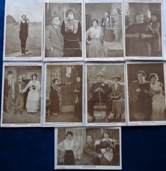 Postcards, Keystone films – 9 postcards from a series of Keystone Cards presented with 'Home Weekly', illustrating comedies produced by Mack Sennett and issued in 1914. The cards feature Mabel Normand, Fatty Arbuckle and Chester Conklin (gen gd)
