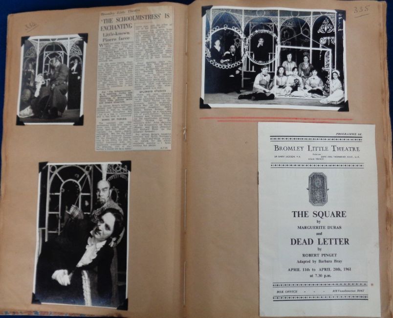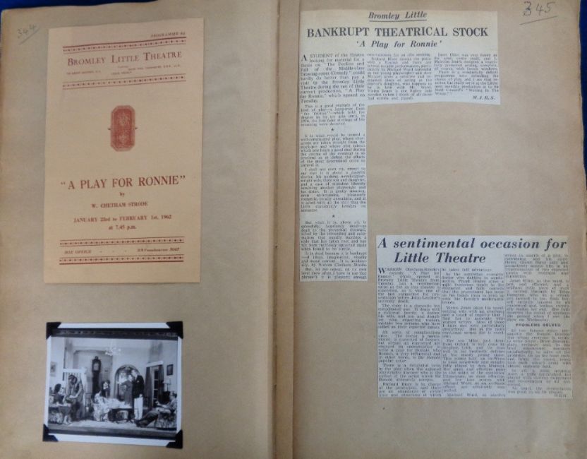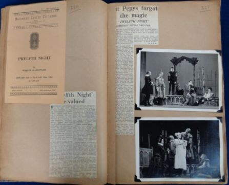 Entertainment, Bromley Little Theatre Scrap Book, a book of laid down theatre programmes and newspaper cuttings with corner mounted professional photographs, 1960-68 (approx. 140 pages). Images include Vanessa Fielding in To Heaven In A Golden Coach (album spine split, o/w gen gd)