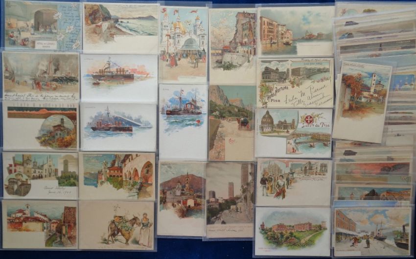 Postcards, Gruss Aus style, approx. 80 attractive chromolithographed cards to include Menton, Sestri Levante, Genova, Naples, Alassio, Stresa, Venezia, Milan, Como, Nice, Cernobbi, Monaco, Ventimiglia, Lugano, Cannes etc. Some u/b, some p/u (gd)