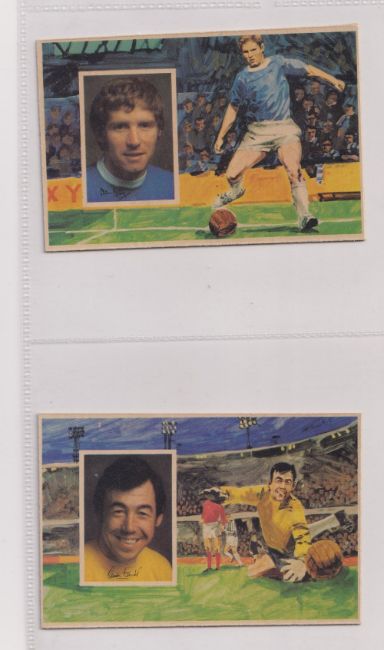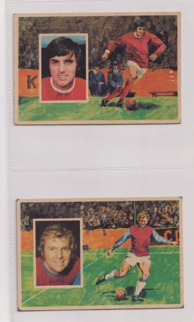 Trade cards, Unknown issuer (possibly package issue), 4 XL sized Footballers (Action shot with Head Portrait inset), George Best, Alan Ball, Bobby Moore (ink marks on corners), Gordon Banks (gen gd except where stated above)