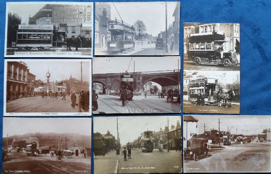 Postcards, Trams, a mixed tram collection of 8 RPs inc. 'Ancient Oxford' showing horse drawn tram and 'Modern' motor bus, 'Oxford Electric Tram (ticket) at last' horse drawn, Strood tram, Luton Arch, Shirley High St Southampton, Cooden Beach, tram terminus Dudley, The Bridge Walsall (mixed condition)