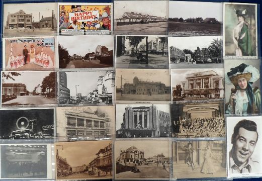 Postcards, Cinema, Theatre and Opera, approx. 350 cards to include Lilly Langtree (several), Josephine Baker (crease), advertising, Picture Palace Ecclesfield, ABC Minors Laurel and Hardy, cinema Gatley Road Cheadle, Ritz Victoria Road Surbiton, Salter's Hall Cinema Droitwich Spa, Le Music Hall Vichy, Capitol Theatre Haymarket, Les Follies Bergères Paris, actors, actresses, buildings etc. (gen gd)