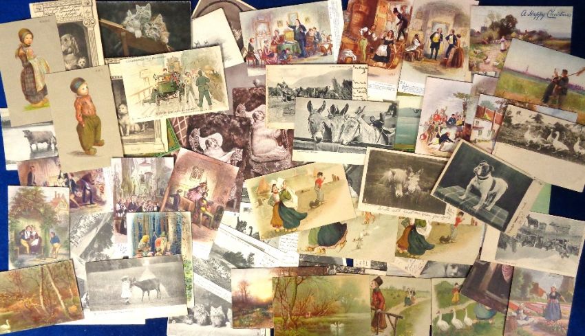 Postcards, a mixed UK subject selection of approx. 92 cards, all published by Tuck, inc. printed b/w cards of animals, with dogs, cats, farm animals, zoo etc. Also 'In Dickens Land' (10) from various series; Shakespeare illustrated (Edmund G Fuller); Dutch children (chromo) etc (mixed condition)