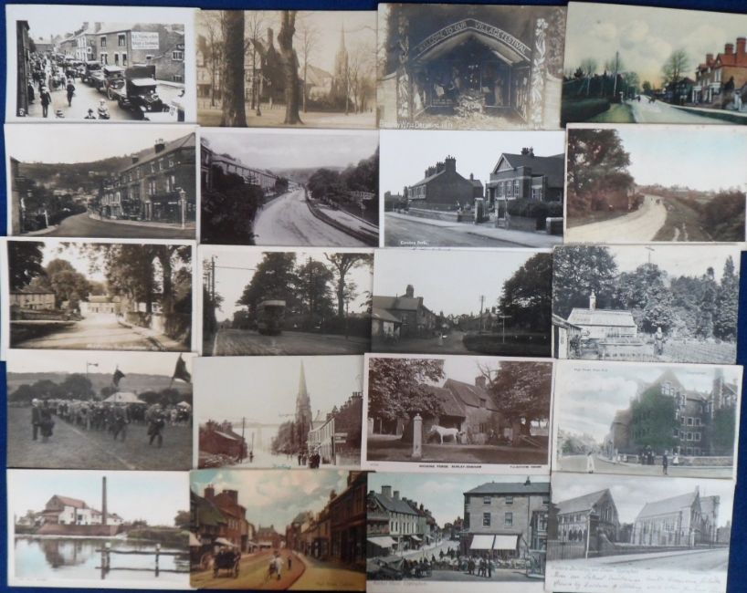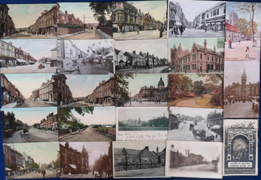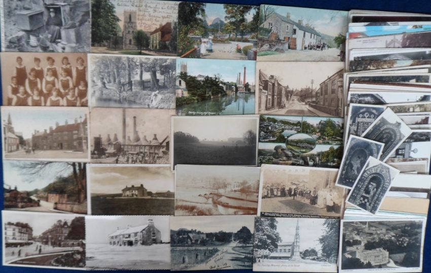 Postcards, a UK topographical mix of approx. 140 cards, mainly of Derbyshire and Leicestershire, with RPs of Shoeing Forge Burley Oakham, Kiveton Park, opening of S Wigston Catholic Church (St Mary's), Well dressing at Higher Buxton, Barlow, Littleover Tram Terminus, Middleton-by-Youlgrave, Long Eaton War Memorial, Matlock Bath Derwent Terrace, and Derwent Parade, New Walk Leicester, Ashby Sq etc . Also court size chromo for Matlock Bath 1901, street scenes and villages, mill, hermit, Market Square etc (mainly gd)