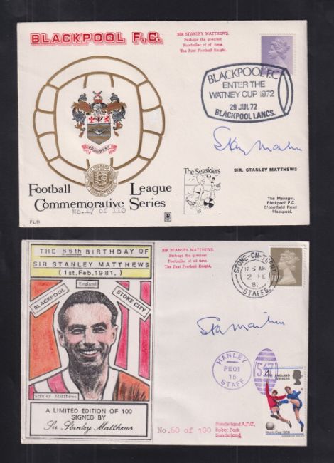 Football autographs, Stanley Matthews, two commemorative, limited edition covers, one Blackpool FC no 17/110 with Blackpool enter the Watney Cup 1972 postmark, the other 66th Birthday celebration cover no 60/100 postmarked Stoke-On-Trent 1981, both with original blue ink signatures (gd/vg) (2)