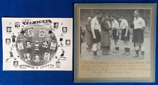 Football, FA Cup Final 1946, card mounted photograph showing the King being presented to the Deby County Team prior to kick, details neatly written below, approx. 24cm square, sold with a souvenir card from the Wolverhampton Wanderers v Leicester City FA Cup Final 1949 showing players & official inset (small tape marks to corners of backs, front gd) (2)