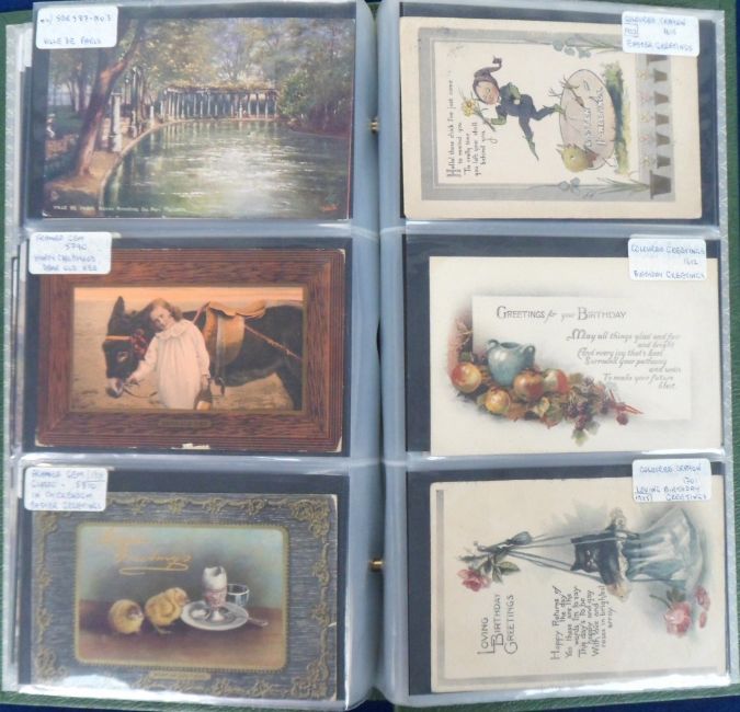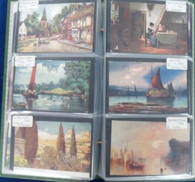 Postcards, a mixed Tuck published collection of approx. 97 cards in modern album, inc. scenic views (Wimbush, Flower), greetings, shipping, aviation, comic, cats (Wain 'A Persian Prince'), owl, dogs etc (gd)