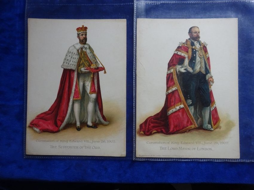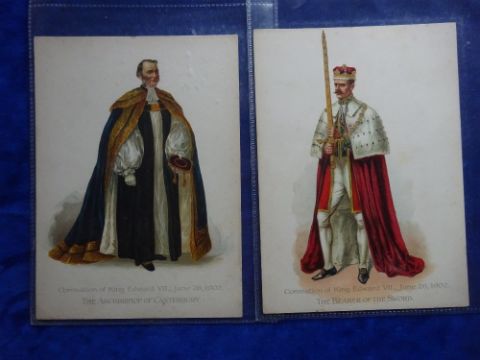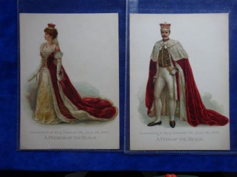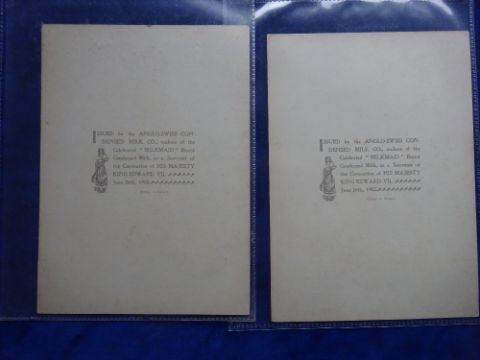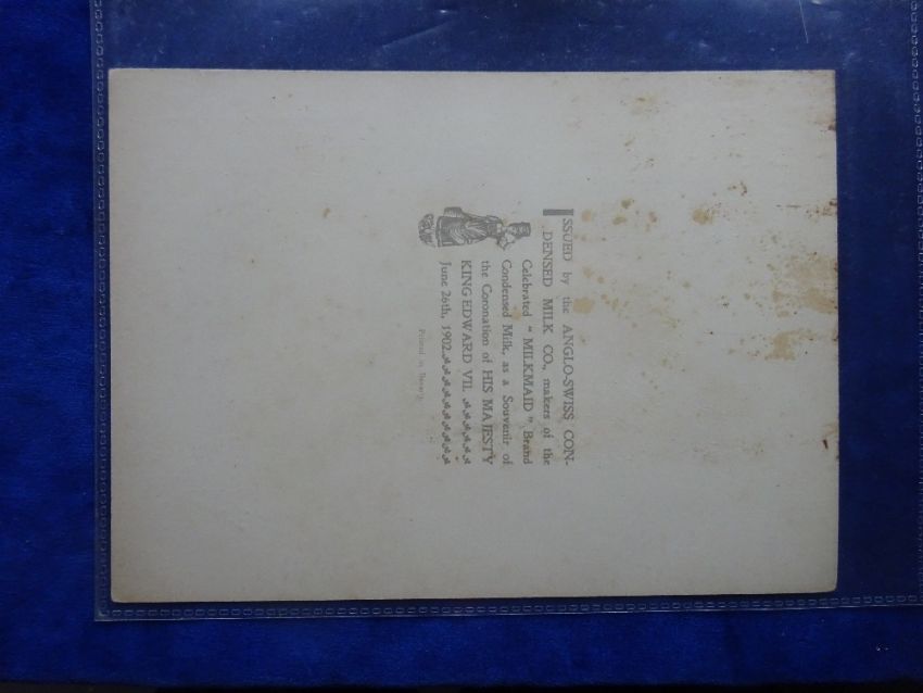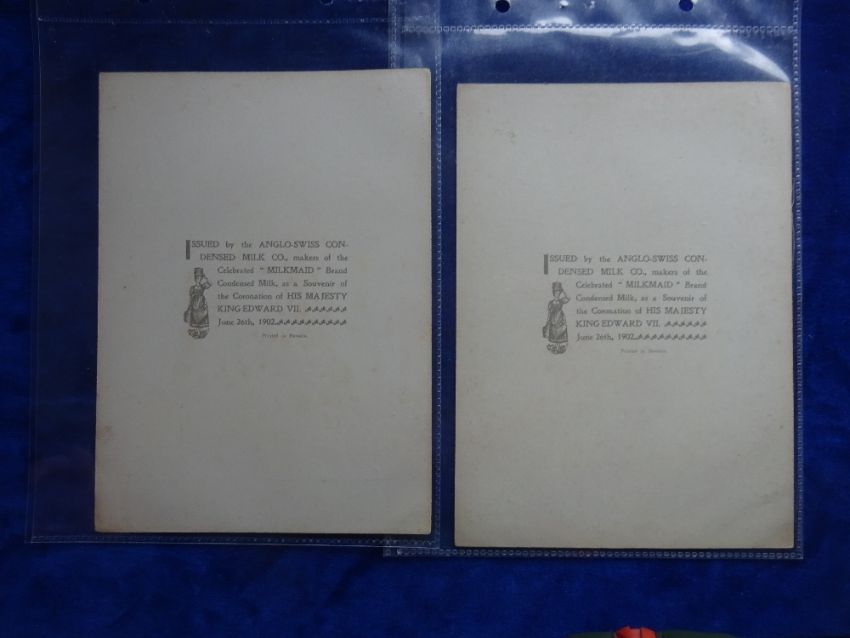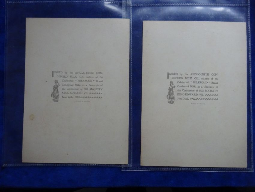 Trade cards, Anglo Swiss Condensed Milk Co. Coronation 1902, 7 cards Cabinet G sized (1 card staining on back rest fair/near gd)