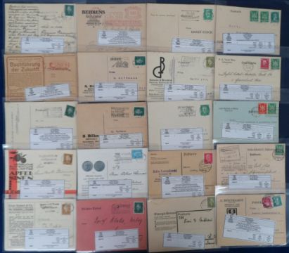 Postal History, a large collection of approx. 340 German postal stationery, postcards, and covers spanning most of the 20th C. The majority stamped and postally used. Includes advertising (business), cash on delivery receipt cards, a few Third Reich period, packet cards, correspondence, official. With a broad range of stamps, postmarks and cachets (mixed condition)