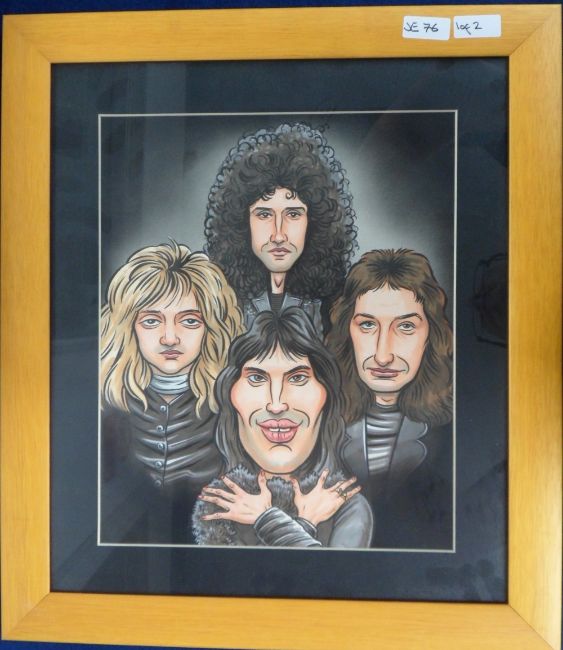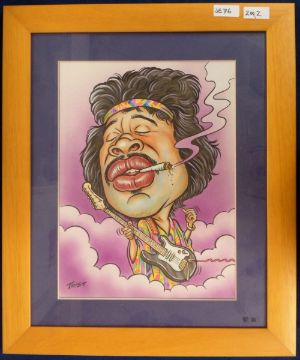 Artwork, Geoffrey Tristram, highly accomplished artist and caricaturist 'Trist', 2 original framed and glazed pictures to comprise Queen taken from the cover of Queen II (approx. overall size 17 x 20") and an image of Jimmy Hendrix (approx. overall size 16 x 19.5") both in matching light wood frames (vg) BUYER TO COLLECT