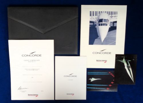 Aviation, Concorde, a grey British Airways leatherette pouch containing brochure, Flight Certificate, writing paper and envelopes in card folder and 2 postcards (gd)