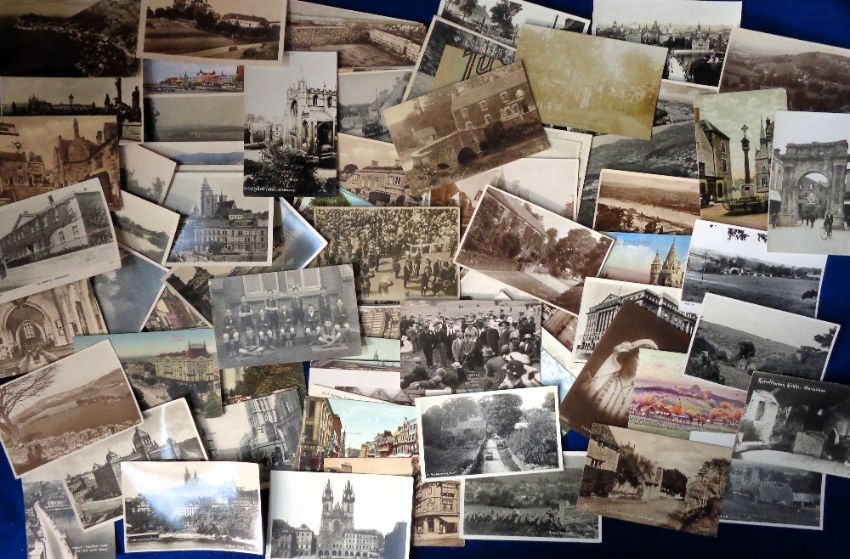 Postcards, Gloucestershire, a mix of approx. 80 cards with RPs of Birdlip village, Square Stow on the Wold, Lechlade, Ermire St Birdlip, Sheepscombe, Elkstone, Aldsworth, Lower Guiting Conservative Fete, Dean Close school group Cheltenham; also good printed street scenes, villages and scenic views. Sold with 30 Eastern European views (mainly gd)