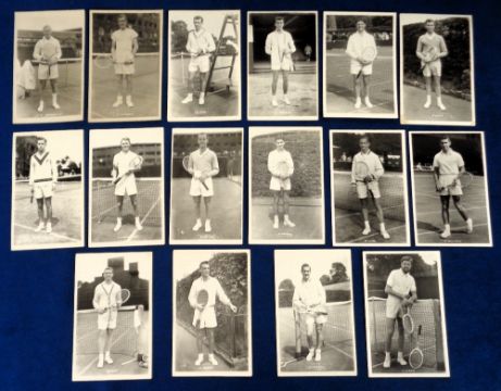 Tennis postcards, a collection of 16 photographic cards all showing Male tennis players from the 1950's, mostly plain back, and many with Tournament wins noted in ink to reverse inc. Laver, Tony Trabert, Neil Fraser, Vic Siexas, Miles Mulligan etc (some with minor faults, gen gd)