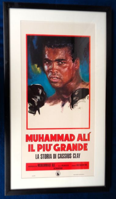 Boxing, Film Poster, 1977, Muhammad Ali 'Il Piu' Grande' ('The Greatest'), Tino Avelli art work poster for William Klein's documentary on Ali, framed & glazed, 77cm x 43cm, (vg) (Buyer to collect as glass or poster could be removed from frame and rolled for posting at buyers request)