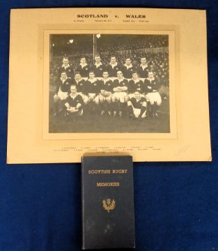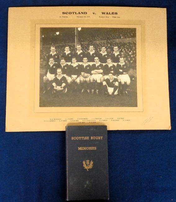 Rugby Union, Scottish International Rugby, a large original b/w card mounted photo showing the Scottish Rugby team from the match v Wales played in Swansea on 6th February, 1937, 36cm x 46cm., Sold with a limited edition booklet 'Scottish Rugby Memories' containing the programmes of Scotland's International Rugby matches, 1934-1945, with many teamgroup photos, bound in blue board with gilt writing & Scottish thistle emblem to front (gd) (2)