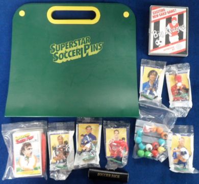 Trade issues, Football selection, Superstar Soccer Pins Collection No 1, complete set of 20 cards & badges plus 6 duplicate cards together with special album, sold with a set of six unopened Sugar Puffs Football cards/figures (1996), 14 magnetic World Cup marbles inc. Glen Hoddle, Terry Butcher, Ray Wilkins etc and a boxed Bertcord Big League card game featuring 8 teams, Leeds, Liverpool, WBA, Arsenal, West Ham, Ipswich, Southampton & Manchester United, with 96 top player cards and also a set of Soccer Dice