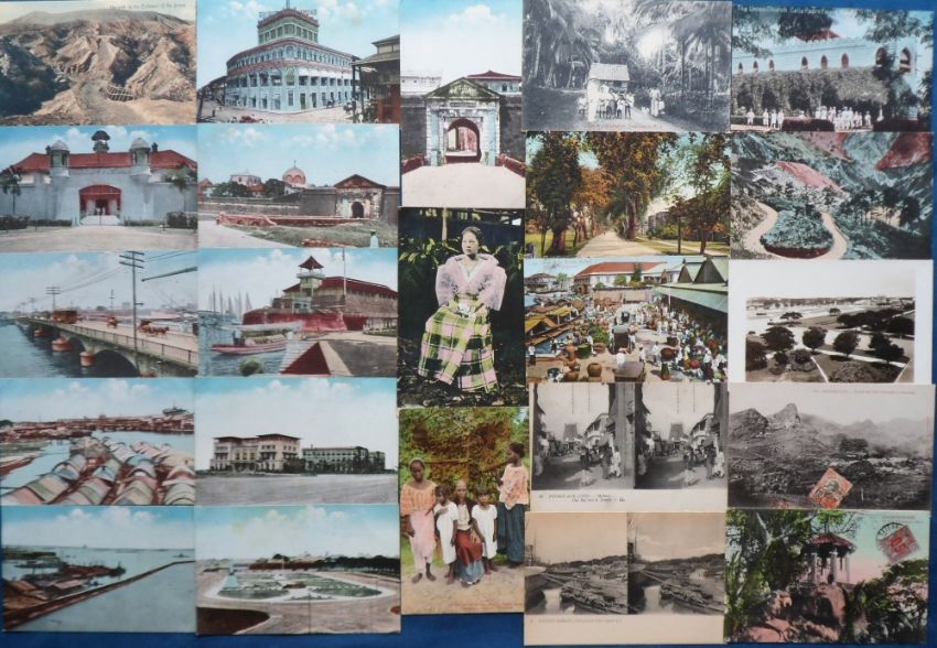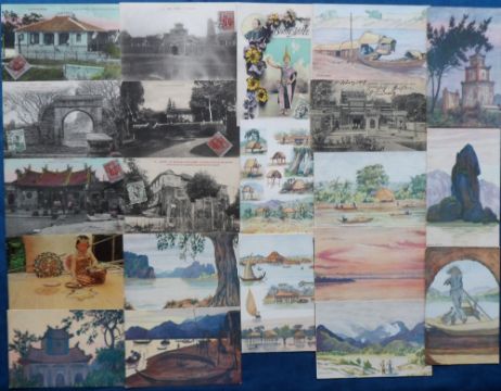 Postcards, Foreign, a Philippines and Indo China mix of approx. 44 cards. Philippines (19) includes Old Bridge of Spain Manila, El Hogar, Bilibid Prison, Fort Santago, Manila Harbour, cocoa plantation Zamboanga. Indo China (25) includes illustrated views by Regnault Sarasin (12), street scenes at Madura, Annam. Also Cholan Pagoda, Tonkin Saigon etc. Many postally used (mainly gd)