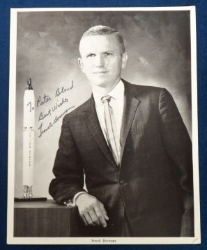 Autograph, Frank Borman (1928-2023), US Astronaut, Commander of Apollo 8 and USAF Colonel, a signed b/w image of Borman standing beside a model of a Titan II rocket (10 x 8") (vg)