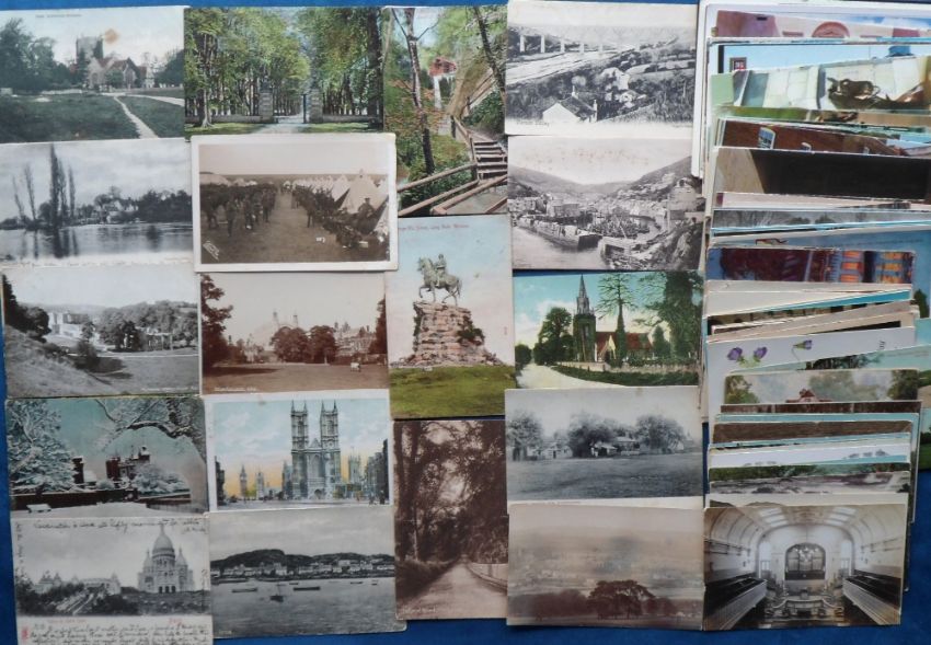 Postcards, a mixed mainly UK topographical selection of approx. 170 cards, with 64 modern (mostly guardsmen in London). Vintage cards include RPs of Westend Mortimer (Terry Hunt), Edith Cavell's grave, portraits, memorial, Wargrave Backwater, Mortimer Church and primitive chapel, Army Camp Cheltenham (2). Also printed street scenes at Wargrave (several), Market Place Wokingham, Nettlebed Windmill, Camp Rd Bramley etc (mixed condition)
