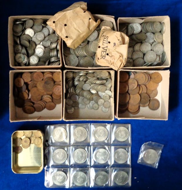 Coins, a large collection of UK silver and copper coins to comprise Half Crowns (80 x 1967, 186 x 1920-1946), Florins (129 x 1920-1946), Shillings (404 x 1920-1946), Sixpences (318 x 1920-1946), three penny bits (15), Pennies (82 x 1906-1967), Half Pennies (152), Churchill Crowns (13) (all quantities are approximate) (mixed condition).