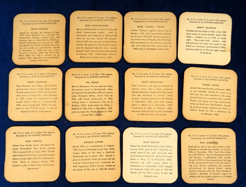 Trade cards, Evening Despatch, Aston Villa Players, 1963, set of 12 cards, beer mat style (some toning, gd) (12)