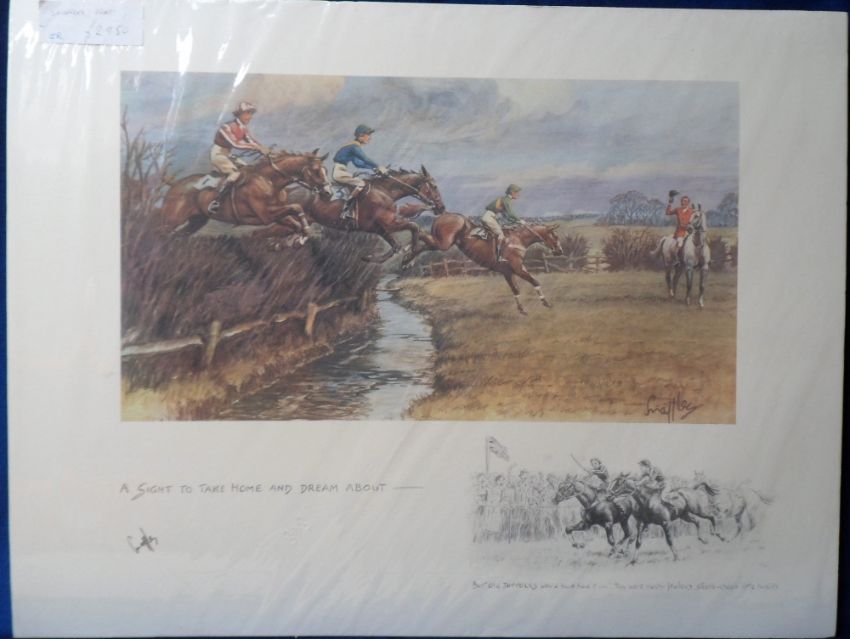 Horse Racing, Snaffles prints, 6 unframed prints on embossed crossed snaffles paper to comprise 'A Sight To Take Home And Dream About', 'The One To Carry Your Half-Crown', 'Sandown Asking 'Em The Question', 'Oh To Be In England Now That April's Here', 'The Grand National The Canal Turn', 'The Soldiers 1911-1912' (mixed sizes from approx. 22 x 26" to 20 x 18") (gd/vg)