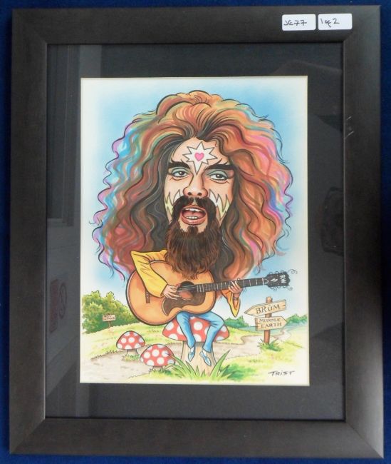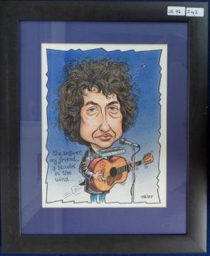 Artwork, Geoffrey Tristram, highly accomplished artist and caricaturist 'Trist', 2 original framed and glazed pictures to comprise Roy Wood (approx. overall size 19 x 16") together with Bob Dylan (approx. overall size 16.5 x 20.5") Both in matching black frames (vg) BUYER TO COLLECT