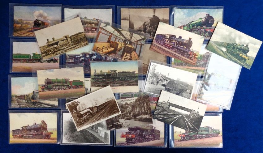 Postcards, Rail, a selection of 27 cards, RPs, printed and artist drawn to include novelty (1), locomotives, pick-up water troughs, carriage interior, Leaholm station, Sulby Glen Tea Gardens I.O.M. etc. (gen gd)