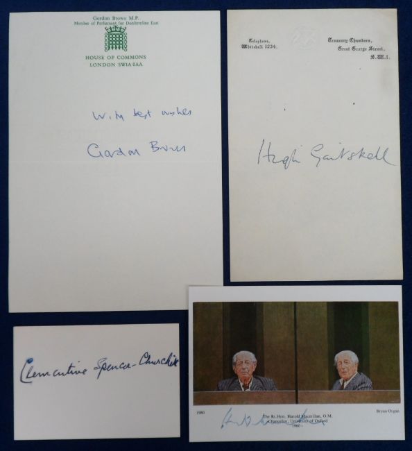 Autographs, Politics, 4 autographs to comprise Gordon Brown (1951) Labour Prime Minister 'With best wishes Gordon Brown' on House of Commons note paper (has been folded), Hugh Gaitskell (1906-1963) Leader of the Labour Party signed on embossed Treasury Chambers, Harold Macmillan (1894-1986) Conservative Prime Minister, signed portrait postcard, Clementine Spencer-Churchill (1885-1977) Member of the House of Lords a signed cream card (approx. size 1.5 x 7.5)