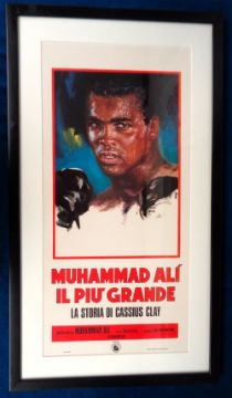 Boxing, Film Poster, 1977, Muhammad Ali 'Il Piu' Grande' ('The Greatest'), Tino Avelli art work poster for William Klein's documentary on Ali, framed & glazed, 77cm x 43cm, (vg) (Buyer to collect as glass or poster could be removed from frame and rolled for posting at buyers request)