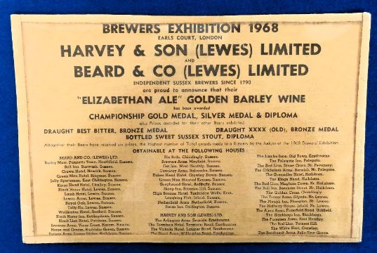 Brewing, Harvey & Son and Beard & Co Sussex Brewers advertisement from announcing the awards received by their beers in the 1968 Brewers Exhibition (gd)