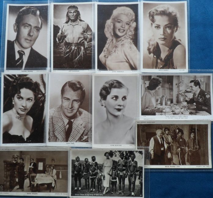 Postcards, Cinema, a cinema collection of approx. 55 cards, with 33 Picturegoers. Includes 'D' series (3), 'W' series (17), 'B' series (1). With Jayne Mansfield, Ekberg, DeCarlo, Isobel Jeans, Errol Flynn, Betty Hutton, Elizabeth Taylor, Roy Rogers, Judy Garland. Also, Joan Collins, Sabrina, Debbie Reynolds, Garbo, Harlow, Chaplin (4) etc (gd)