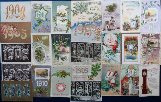 Postcards, Greetings, a mix of approx. 240 greetings cards, with many chromos and embossed inc. Year Dates 1905 HTL, embossed 1911 (with cats), HTL 1909 (new year), and many others. Also Jan 1st, longcase clocks, Father Time, wise men, angels, black cats, Xmas trees, black girl (Thanksgiving), balloon, anthropomorphic, locos, pig, gnomes, town cryer, post box, chicken, christening, music, elves etc (mixed condition)