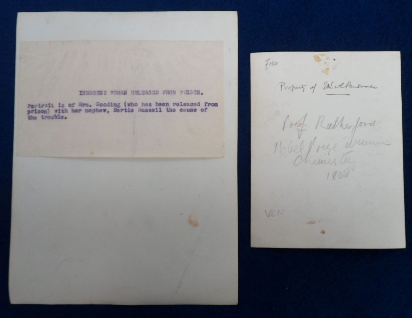 Photographs, Rose Gooding, a 6.5 x 8.5" b/w Photopress image (with press note attached to reverse) of falsely accused and imprisoned poison pen letter writer Mrs Rose Gooding holding her toddler nephew Bertie Russell who lived in Littlehampton in the 1920s and upon whom the film Wicked Little Letters was based (vg). Together with a b/w 4.5 x 5.75" image of Professor Sir Ernest Rutherford who was awarded the Nobel Prize for Chemistry in 1908 (pin hole to top and bottom and some light tape marks)