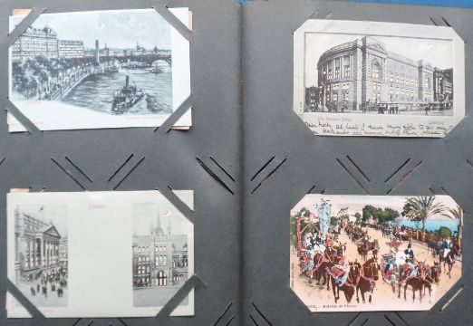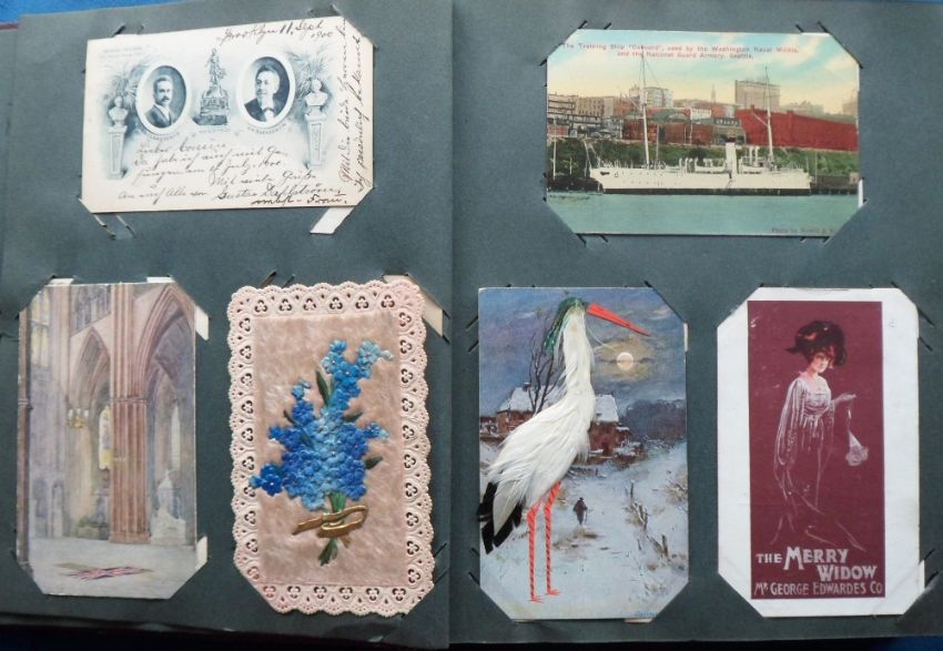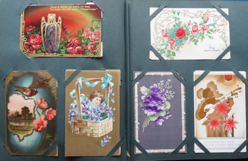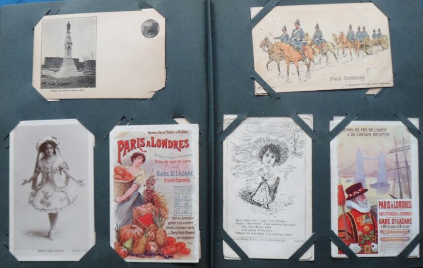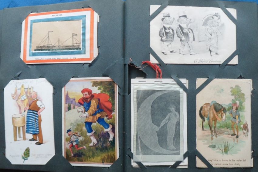 Postcards, a vintage album of approx. 221 mixed subject cards, mostly novelty and the unusual. Includes Epps Nature Series, HTLs, leather, applique, theatre ads (Merry Widow), feathers, Oregon Rose Festival 1908, celluloid, comic, year dates, pigs, New York celebration 1909, children, fireworks, fire brigade, toothache, pullouts, pushouts, Birn Bros, embossed, fortune telling, Ellen Terry Jubilee 1906, Paris - London Rail ads (2), foreign missions, exhibitions, seaweed, silhouettes, History of Printing ads for Oliver typewriters, animals, elves, gnome, black girl, Santa etc. Viewing needed (mainly gd)