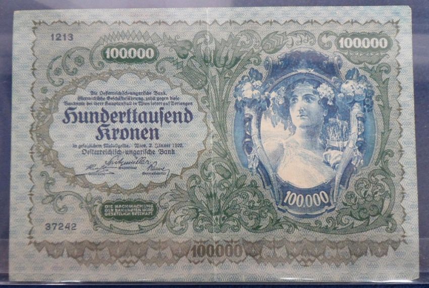 Bank Note, Austrian Government First Issue 100,000 Kronen bank note dated 1922 (has been folded down centre, o/w gd)