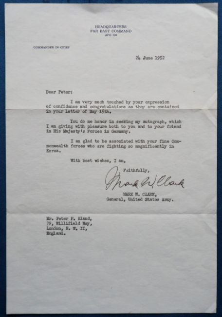 Autograph, Military, Mark W. Clark (1896-1984), General US Army, a typed personalised letter to the collector on Headquarters Far East Command note paper, signed in ink and dated 24 June 1952 (vg)