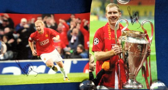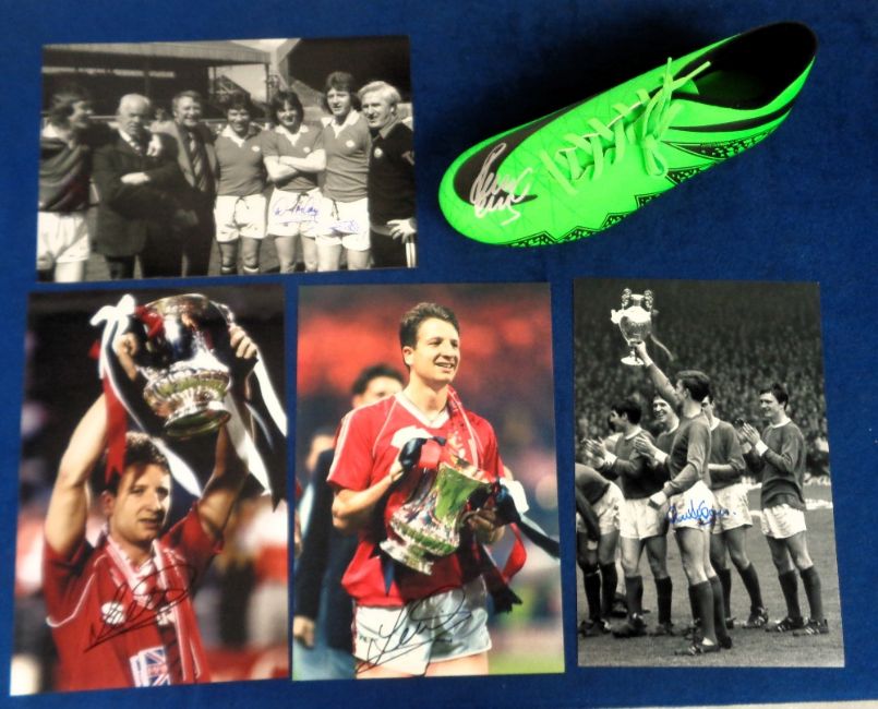 Football autographs, Manchester United, 12 signed photos, mostly later produced images from earlier photos, 12" x 8" showing former players from the 1960s - 1980s, inc. Whiteside, Pearson, Moran, Hill, McIlroy etc, sold with two 16" x 12" photos, depicting Paul Scholes scoring the winner v Barcelona in the 2008 Champions League semi-final, and posing with the trophy after victory in the Final v Chelsea, both signed in black marker, sold with a Green Nike Football boot signed by Scholes in silver marker. (vg)
