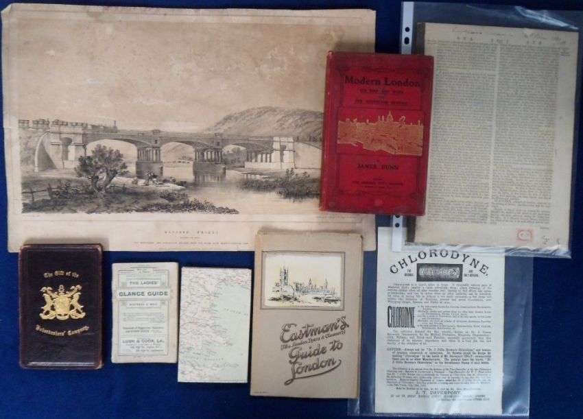 Ephemera, an interesting selection of items to comprise The Ladies Glance Guide, an 1882 dated small leather volume entitled 'The Gift of the Worshipful Company of Haberdashers' given to Edwin Noel Layton on being bound apprentice 1904, a 1906 volume entitled 'Modern London Its Sins and Woes and the Sovereign Remedy' by James Dunn, Eastman's (The London Dyers and Cleaners) Guide To London, insert advertising Dr J. Collis Browne's Chlorodyne circa 1880, a Bradshaw's Railway map of Central Europe, an engraving entitled 'Defford Bridge' showing the a Birmingham and Gloucester steam train on the bridge by E.I. Dolby (fair), a National Parks Commission 1970s poster entitled 'A Code For The Country' and more (gen gd)