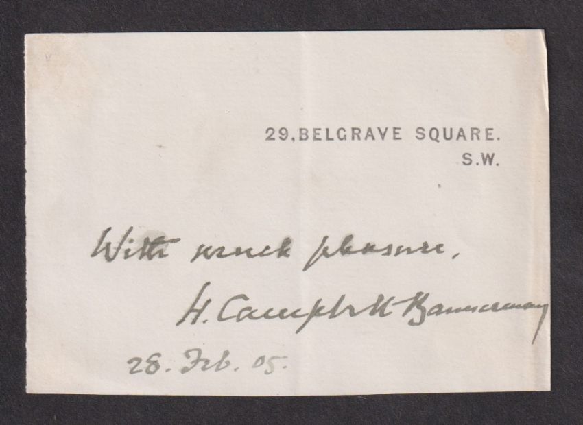 Autograph, Politics, Henry Campbell-Bannerman (1836-1908), Liberal British Prime Minister (1905-08), signed on clipped cream headed paper with the address 29, Belgrave Square S.W. and dated 28 Feb 05 (approx. size 11.5 x 8 cms) (some adhesive marks and a little smudging)