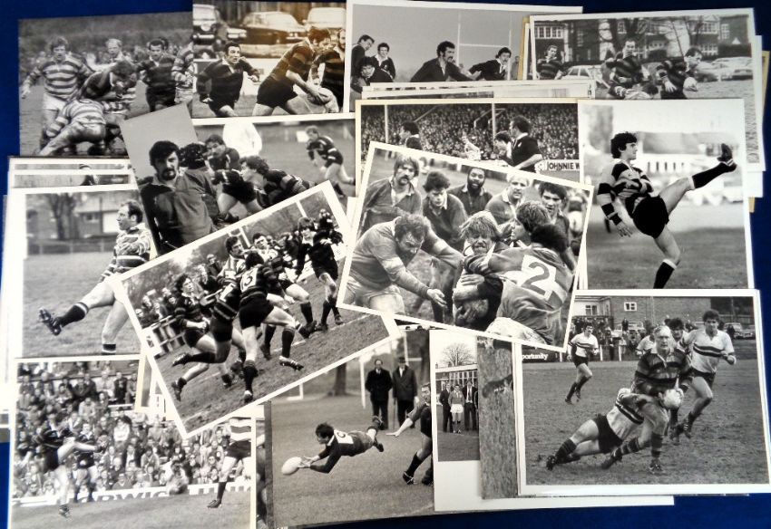 Rugby Union press photographs, a collection of 70+ b/w press photos various sizes, mostly Moseley RFC match action images, 1980's (gd)