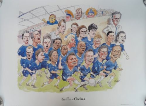 Chelsea FC, a collection of modern posters, FAC Final flags, rolled banner, kit adverts, team group large pictures, Peter Bonetti Poster (approx. 58cm x 44cm), caricature prints, full size poster of Frank Lampard, etc (several all rolled and contained in two large tubes)