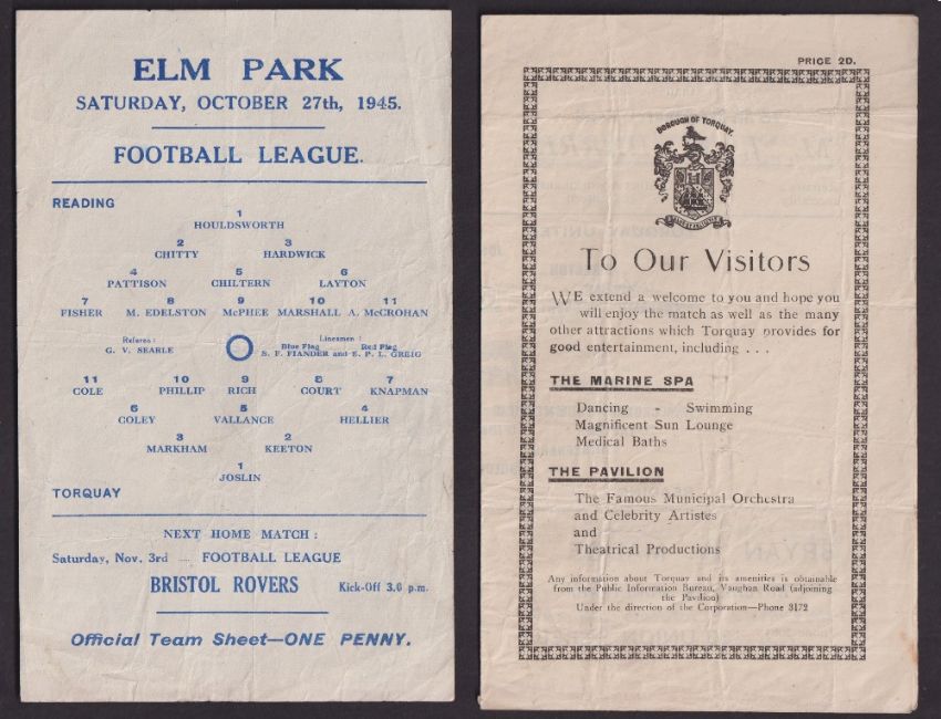 Football programmes, two programmes, Reading v Torquay, 27 October 1945 (single sheet) & Torquay v Reading 1945/6 (4 pages, tc), both Football League (South) (2)
