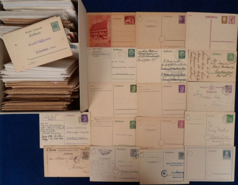Postal Stationery, German, approx. 450 items mostly dating from the 1880s to the 1990s showing a wide variety of postmarks to include Olympic Games, rail, 1961 Leipzig Autumn Fair, 1956 Cycling First Day Cover, horses, music, political etc. Pre franked postcards p/u and non p/u. Many embossed envelopes. A wide selection (gd)