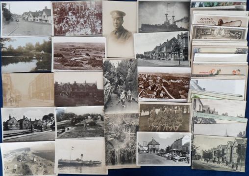 Postcards, a mixed selection of approx. 91 UK topographical and subject cards, with RPs of Shell Garden Leven, Station Rd Oxted, Barnehurst to Erith Rd, aerial view of Jamboree at Arrowe Park 1929, Elmdon Airport, Pimperne Church, Wimborne, Galleywood Common, Watlington, River Crane Isleworth, P.O Emery Down, Bridge Foot Iver, Hanney, Low Hill Baildon, Neston, Pyrford Lock etc. Subjects include silks, naval ships, Wielandt, Hurn airport, haymaking (3 RPs), Queen Victoria, North Staffs Railway officials (7), and printed street scenes (some LLs) and scenic views (mainly gd)