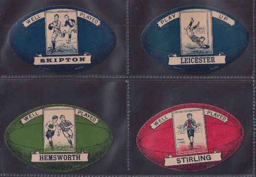 Trade cards, Rugby, Baines, 4 rugby ball shaped cards, Well played Skipton', 'Play up Leicester', 'Well played Hemsworth' & 'Well Played Stirling' (gd)