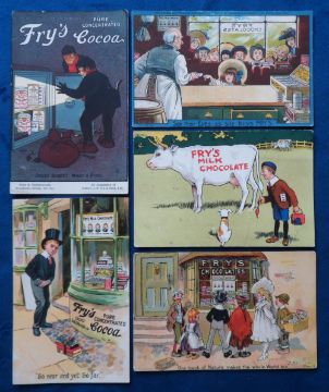 Postcards, Advertising, a Fry's poster advert collection of 5 cards, inc. white cow in field captioned 'Fry's Milk Chocolate'; children looking in shop windows at Fry's Chocolates; 'See their eyes as she buys Fry's' children looking through shop window; burglars open safe of Fry's Cocoa 'Great Scot what a find'; and boy in top hat looking in his pocket for the price of a bar of milk chocolate 'So near and yet so far' (a few age marks o/w mainly gd)