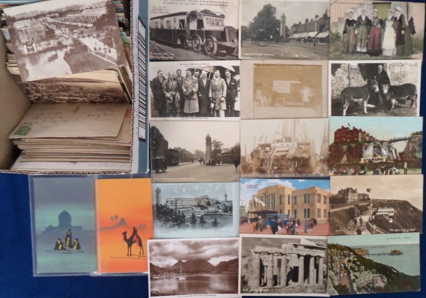Postcards, a mixed age collection of approx. 300 cards, mostly UK and foreign topographical (mainly France and Switzerland). A few RPs inc. wreck of 'Survic' in dry dock at Southampton (Bragg), Farmer's Supply Assoc' delivery van (Tunbridge Wells), Sir Alan Cobham's Air Display team and staff, Clock Tower Clapham (Card House), Town Clock Clapham, also printed HTL of Crystal Palace, Micheline train, a few greetings and ethnic (mixed condition)